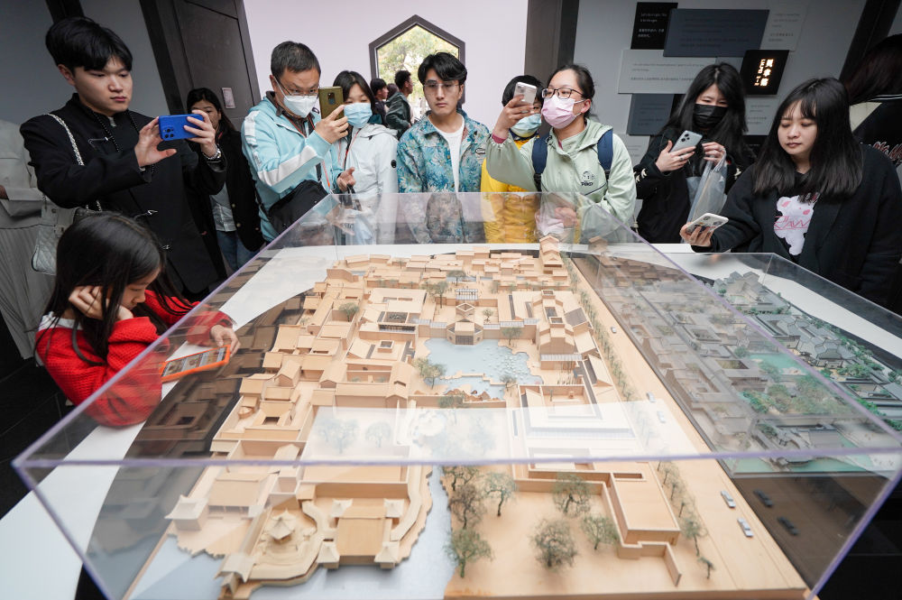 參觀(guān)者在蘇州博物館觀(guān)看蘇州博物館設計模型(2023年4月5日攝)。新華社記者 李博 攝