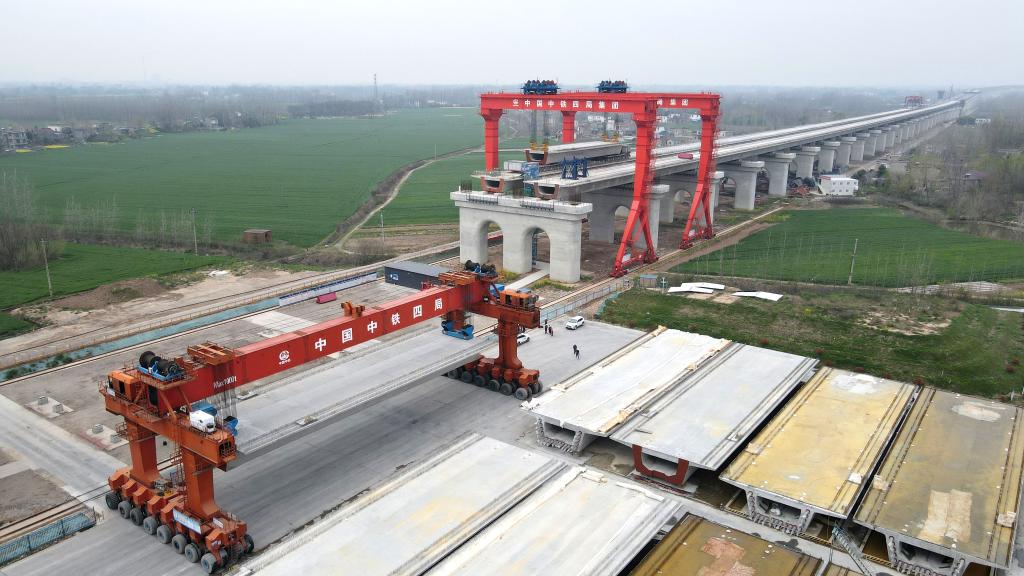 這是3月29日拍攝的中鐵四局巢馬城際鐵路箱梁架設現場(chǎng)(無(wú)人機照片)。