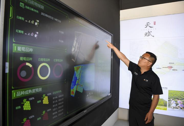 6月5日,中糧長(cháng)城天賦酒莊總經(jīng)理都振江在介紹酒莊的智慧葡萄園灌溉數據平臺。新華社記者 馮開(kāi)華 攝