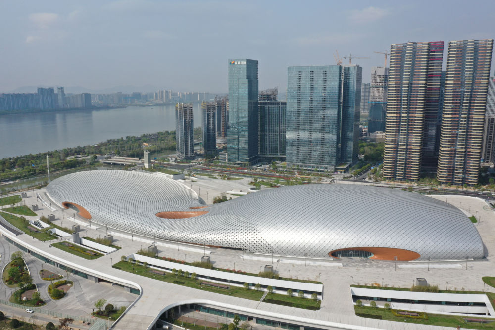 2021年8月2日拍攝的杭州奧體中心場(chǎng)館群(無(wú)人機照片)。新華社發(fā)(杭州亞組委供圖)