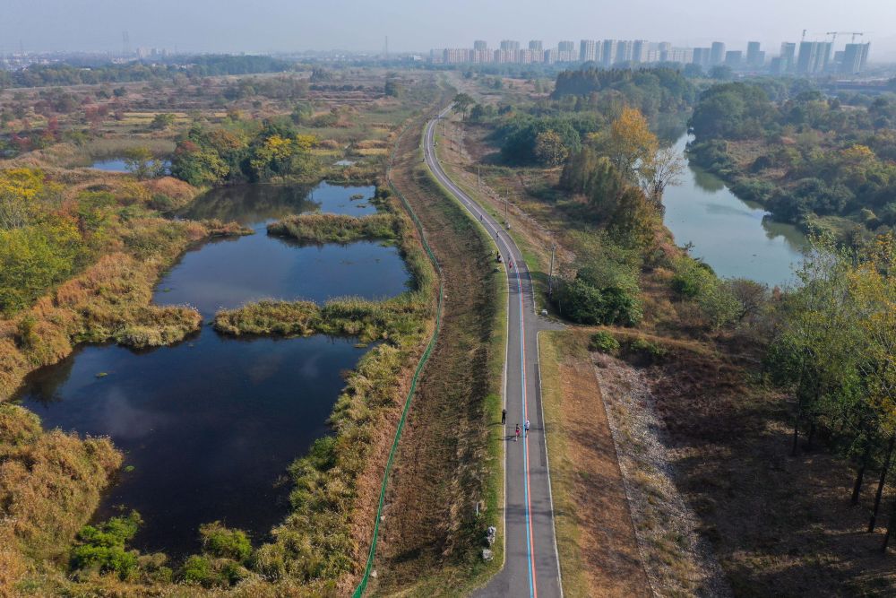 2022年11月12日,運動(dòng)愛(ài)好者們在浙江省杭州市余杭區瓶窯鎮北湖草蕩生態(tài)濕地的健身游步道上參加健康跑比賽(無(wú)人機照片)。新華社記者 徐昱 攝