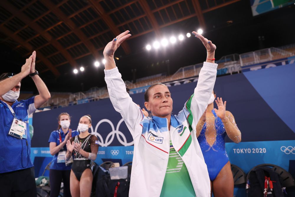 2021年7月25日,46歲的烏茲別克斯坦體操名將丘索維金娜在東京奧運會(huì )體操女子資格賽后向觀(guān)眾揮手致意。新華社記者 曹燦 攝