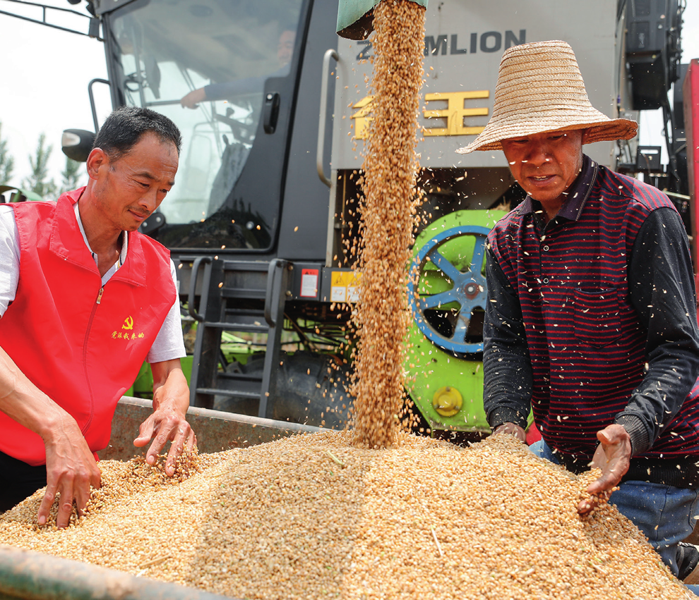 河南省開(kāi)封市尉氏縣南曹鄉的黨員志愿者幫助農戶(hù)搶收小麥(2023年5月31日攝)李新義攝 / 本刊