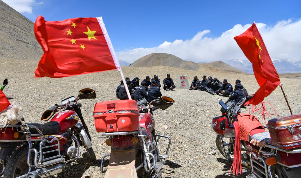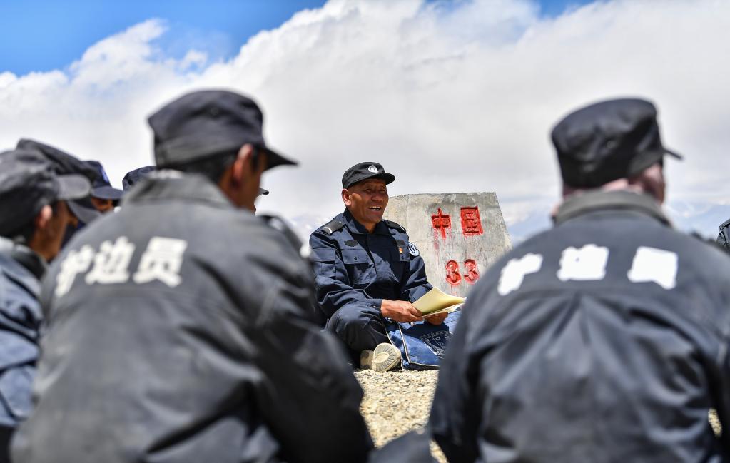 在33號界碑處,護邊隊在隊長(cháng)的帶領(lǐng)下開(kāi)展學(xué)習(6月2日攝)。新華社記者 晉美多吉 攝