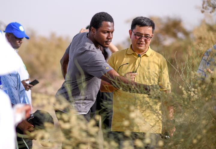 2023年6月13日,在中科院新疆生態(tài)與地理研究所策勒沙漠研究站天然實(shí)驗區,中國科研人員買(mǎi)爾當(右一)為參加第二屆非洲綠色長(cháng)城建設技術(shù)培訓班的學(xué)員講解。新華社記者 王菲 攝