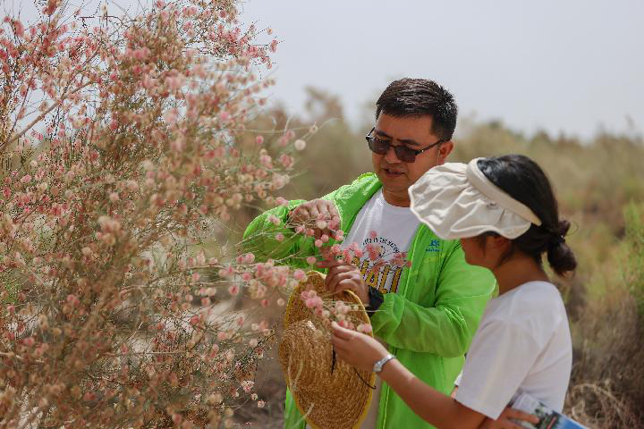 2023年6月12日,在中科院新疆生態(tài)與地理研究所策勒沙漠研究站天然試驗區,買(mǎi)爾當和學(xué)生查看沙拐棗生長(cháng)情況。新華社記者 郝昭 攝