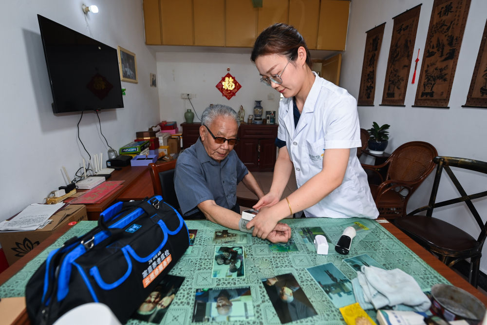家庭醫生上門(mén)為住在浙江省嘉興市秀洲區新塍鎮蓬萊社區的83歲獨居老人孫志龍測量血壓(2023年6月15日攝)。新華社記者 徐昱 攝