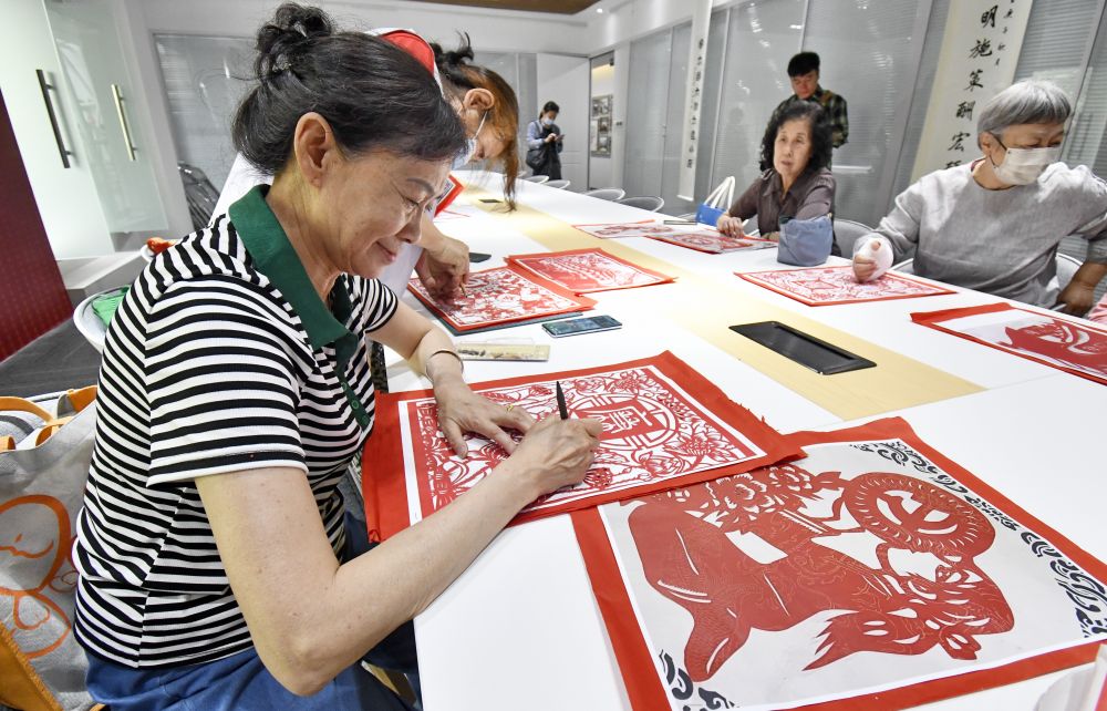 北京朝陽(yáng)無(wú)限社區的老年人在社區養老驛站參加剪紙活動(dòng)(2023年5月17日攝)。新華社記者 李欣 攝