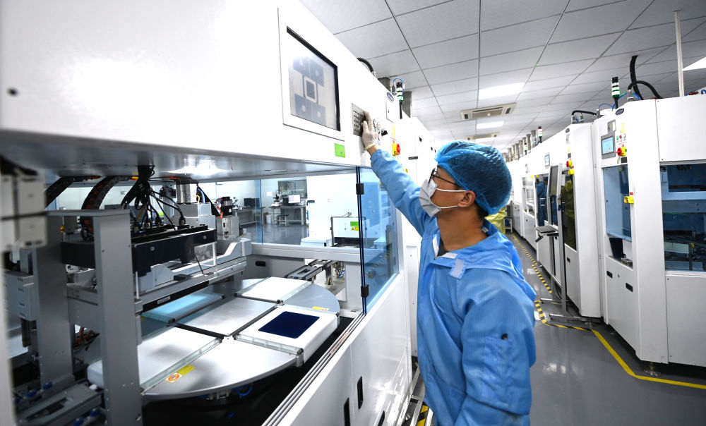 在杭州市富陽(yáng)區春江街道富春灣新城的杭州正銀電子材料有限公司的研發(fā)實(shí)驗室內,自動(dòng)化設備在進(jìn)行光伏板的絲網(wǎng)印刷(3月22日攝)。新華社記者 徐昱 攝