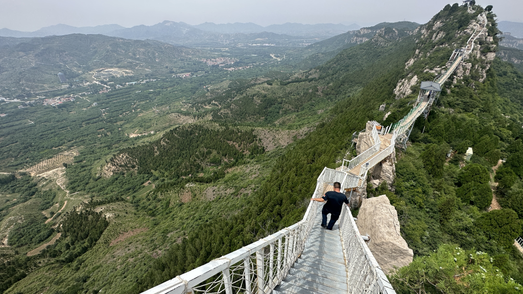 沿架設在山脊的棧道拾級而上,來(lái)到山東省濟南市長(cháng)清區萬(wàn)德街道靈巖村景區的制高點(diǎn),陣陣松濤洗盡夏日的燥熱。放眼遠眺,藍天白云和郁郁蔥蔥的群山在視野盡頭相融,靈巖寺景區和村里的一眾游樂(lè )設施盡收眼底。