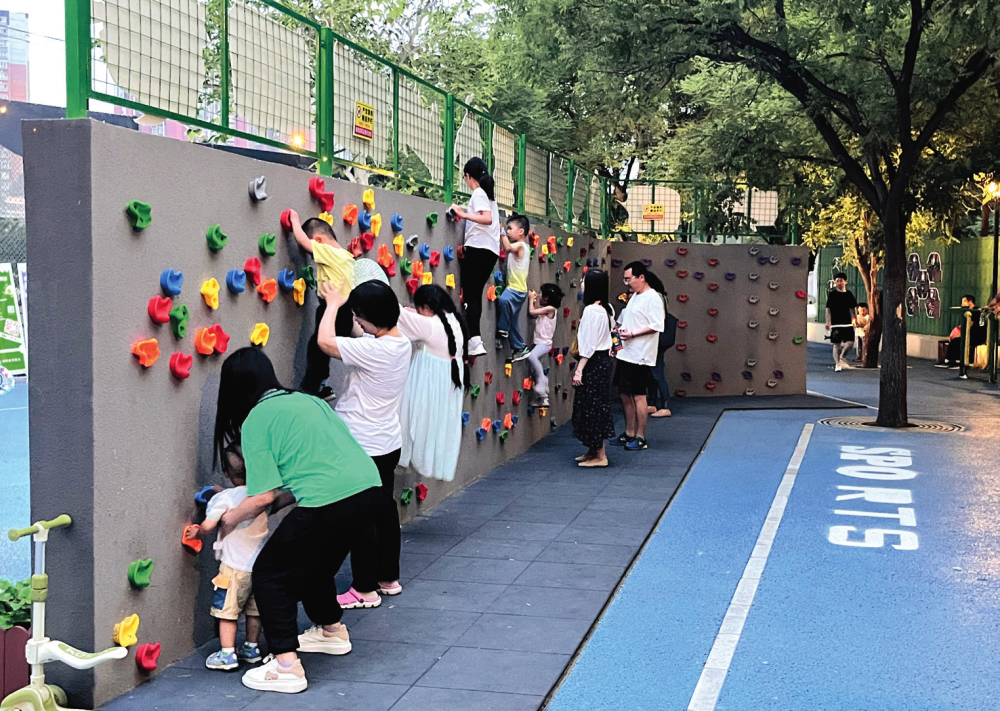 北京石景山區五芳園健身苑“護苗”基地的攀爬墻處,家長(cháng)正陪伴孩子攀爬玩耍(2023年6月18日攝) 劉淏煜攝 / 本刊