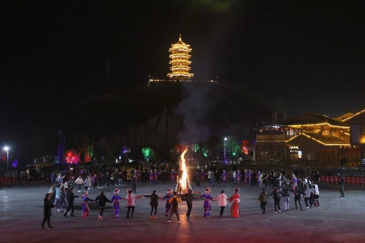 貴州省晴隆縣阿妹戚托小鎮易地扶貧搬遷群眾和游客在金門(mén)廣場(chǎng)圍繞篝火跳舞(3月29日攝)。新華社記者 崔曉強 攝