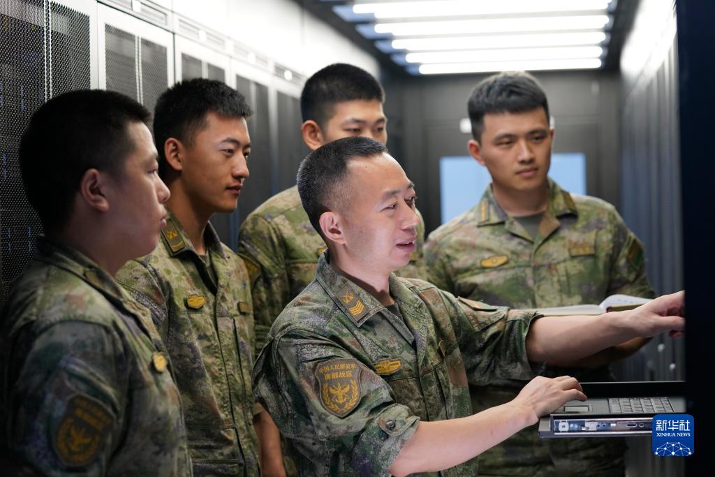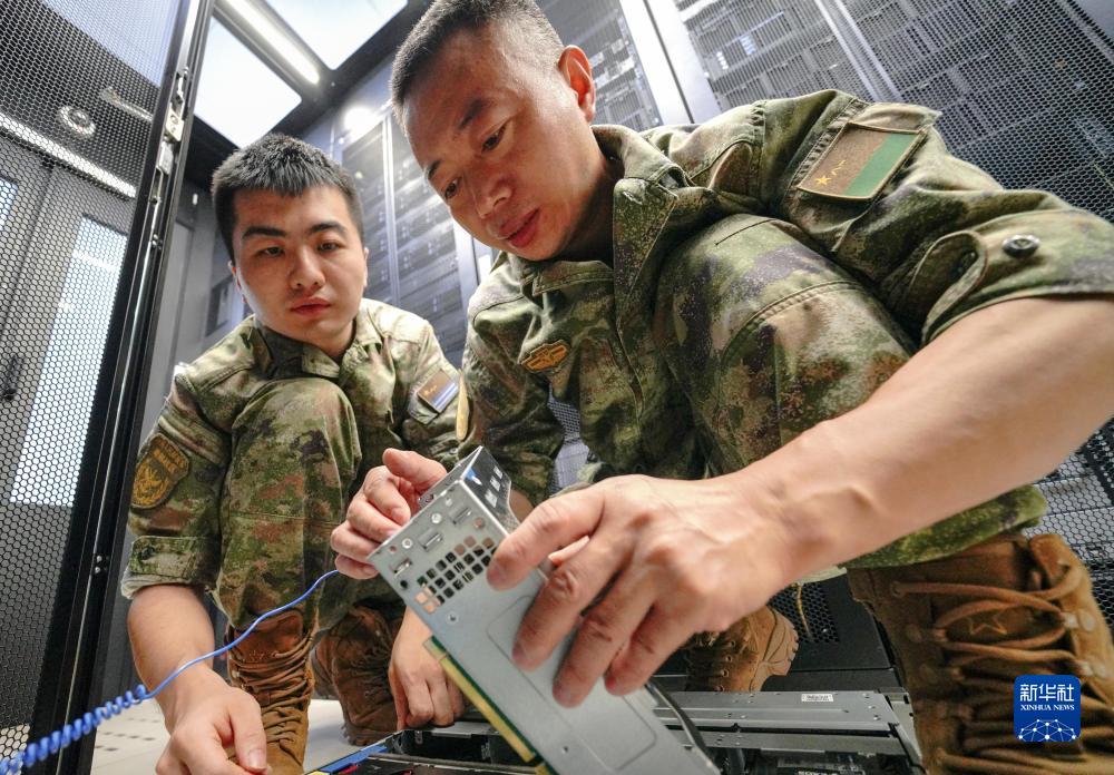 葉升學(xué)(右)和戰友一起檢修服務(wù)器(6月30日攝)。新華社發(fā)(欒鋮 攝)