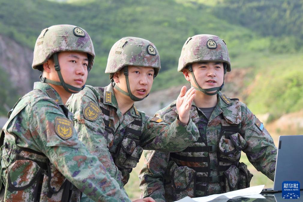 中部戰區某保障隊高級工程師袁偉(中)與團隊成員進(jìn)行戰場(chǎng)勘察(6月2日攝)。新華社發(fā)(詹亨吉 攝)