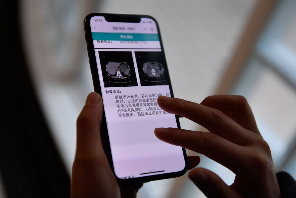 2021年1月20日,在杭州市余杭區第一人民醫院,居民通過(guò)手機使用“健康余杭智慧云共享平臺”查看檢查圖文報告。新華社記者 黃宗治 攝