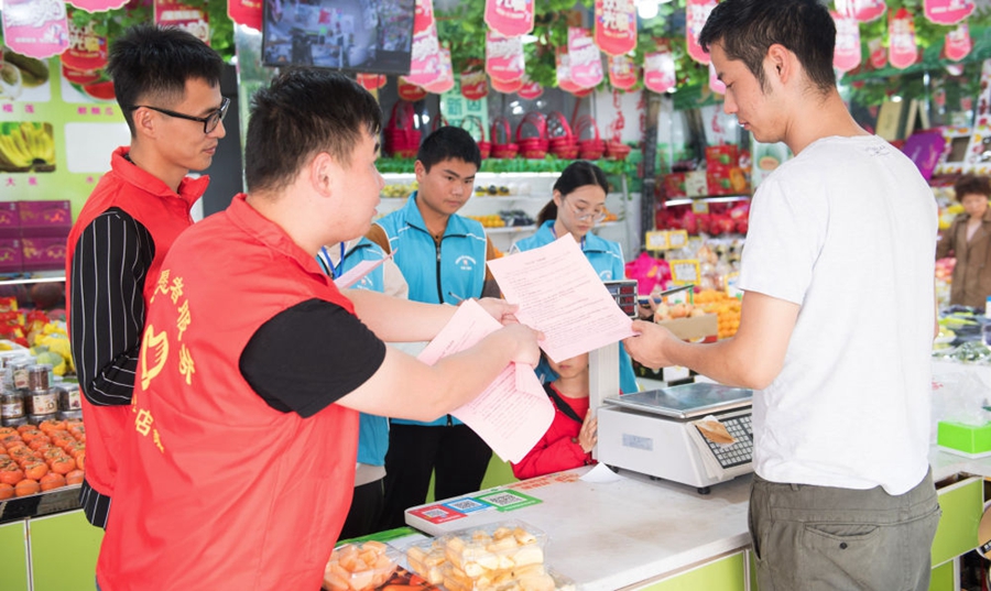 浙江省湖州市吳興區八里店鎮結合主題教育和“三服務(wù)”,推進(jìn)“民生大走訪(fǎng)”工作機制,全體網(wǎng)格員下沉村、社一線(xiàn),了解社情民意,化解矛盾糾紛,服務(wù)村社群眾。這是八里店鎮中心片區網(wǎng)格員(藍衣者)和志愿者(紅衣者)對一家店鋪進(jìn)行平安問(wèn)卷調查(2019年10月31日攝)。新華社記者 翁忻旸 攝