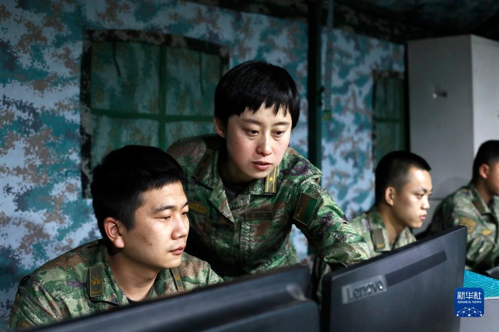戰略支援部隊某信息通信團政治工作處副主任趙麗(中)對學(xué)兵進(jìn)行信息通信業(yè)務(wù)指導(6月8日攝)。新華社發(fā)(劉紹彤 攝)