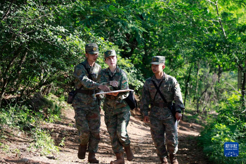 戰略支援部隊某信息通信團政治工作處副主任趙麗(中)與戰士一起進(jìn)行定向越野課目訓練(6月8日攝)。新華社發(fā)(張家軍 攝)