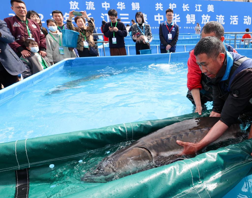 3月26日,在湖北宜昌,工作人員在活動(dòng)現場(chǎng)轉運中華鱘準備放流。新華社發(fā)(楊東 攝)