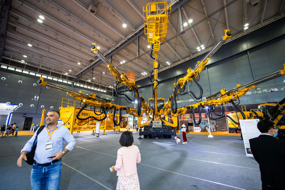 在長(cháng)沙國際會(huì )展中心,觀(guān)眾在第三屆長(cháng)沙國際工程機械展覽會(huì )參觀(guān)展出的工程機械設備(5月15日攝)。新華社記者 陳思汗 攝