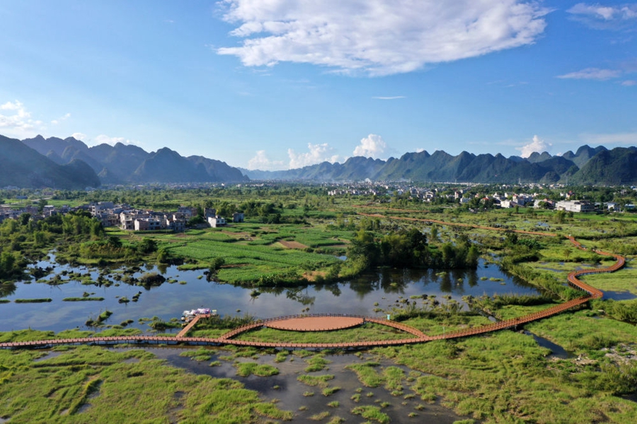 2021年8月31日拍攝的廣西都安瑤族自治縣澄江國家濕地公園景色(無(wú)人機照片)。新華社記者 陸波岸 攝