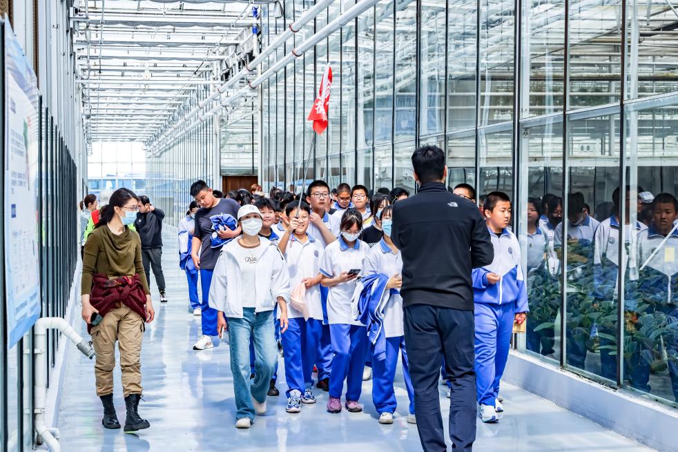 學(xué)生們在天津市東信花卉有限公司智能化溫室花卉種植基地參觀(guān)。(受訪(fǎng)者供圖)