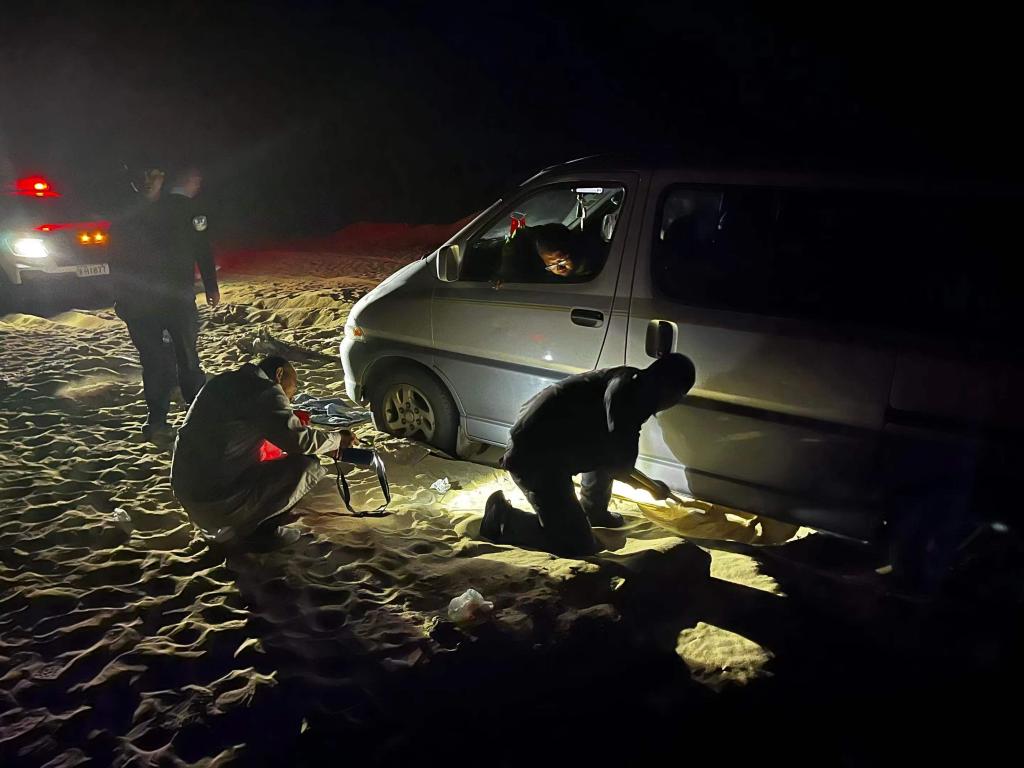 2023年8月6日,茫崖市公安局民警正在鏟沙,準備將陷入積沙的被困車(chē)輛拉出來(lái)。(茫崖市公安局供圖)