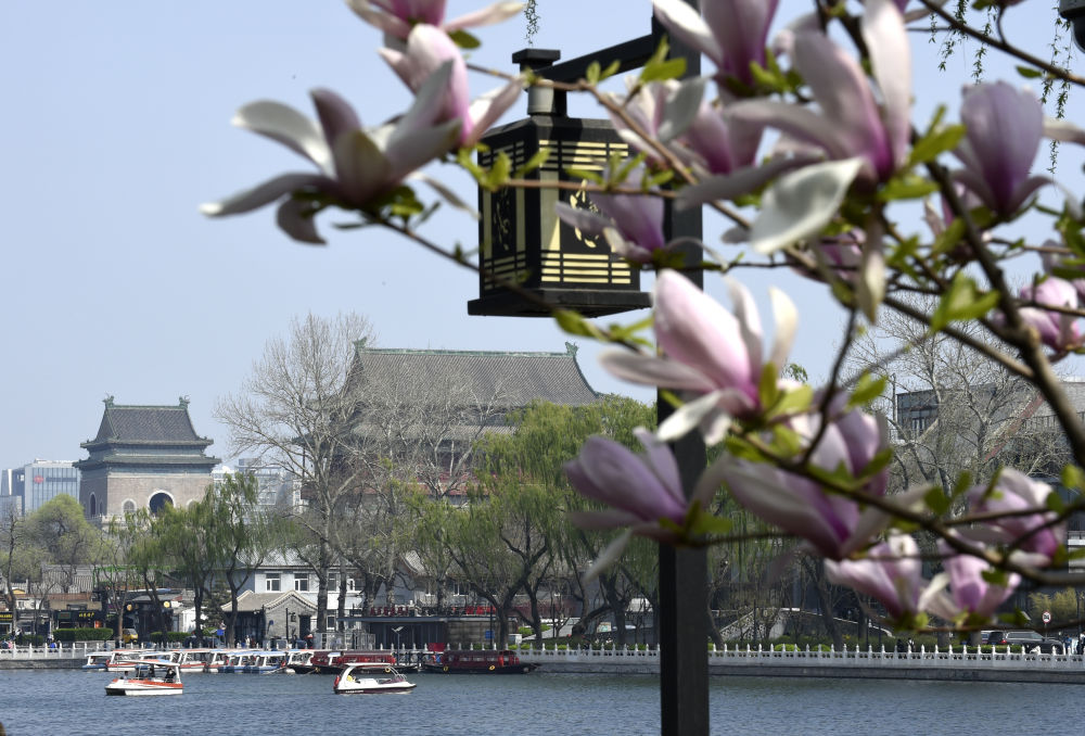 從什剎海東岸遠眺北京鐘鼓樓(3月31日攝)。新華社記者 羅曉光 攝