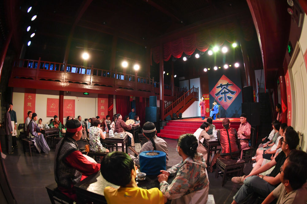 在北京市東城區顏料會(huì )館,觀(guān)眾在欣賞由北京市曲劇團演員帶來(lái)的沉浸式北京曲劇《茶館》(7月7日攝)。新華社記者 鞠煥宗 攝