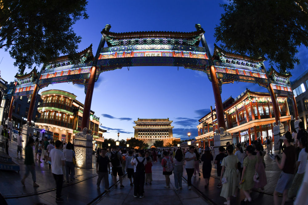 游客在位于北京中軸線(xiàn)的前門(mén)大街參觀(guān)游覽(7月8日攝)。新華社記者 鞠煥宗 攝