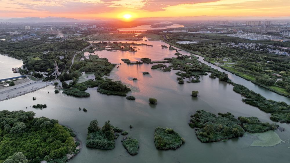 夕陽(yáng)下的滹沱河石家莊段(2023年7月15日攝,無(wú)人機照片)。新華社記者 朱旭東 攝