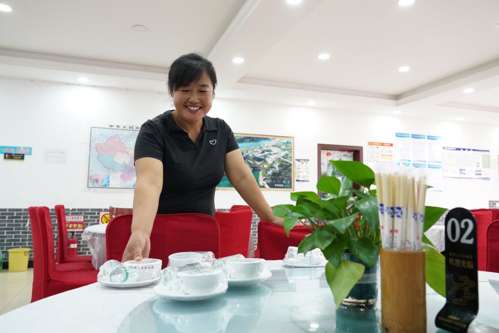 石家莊平山縣西柏坡鎮西柏坡村村民齊紅寶在經(jīng)營(yíng)的酒店里擺放餐具(2023年10月18日)。新華社記者 朱旭東 攝
