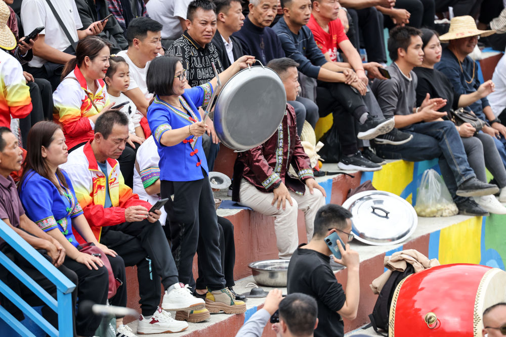 觀(guān)眾在看臺上敲鐵鍋助威(2023年10月25日攝)。新華社記者 歐東衢 攝
