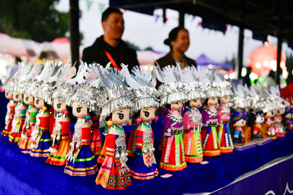 當地群眾在臺盤(pán)鄉球場(chǎng)旁搭建的非遺集市上銷(xiāo)售文創(chuàng )產(chǎn)品(2023年10月27日攝)。新華社記者 楊文斌 攝