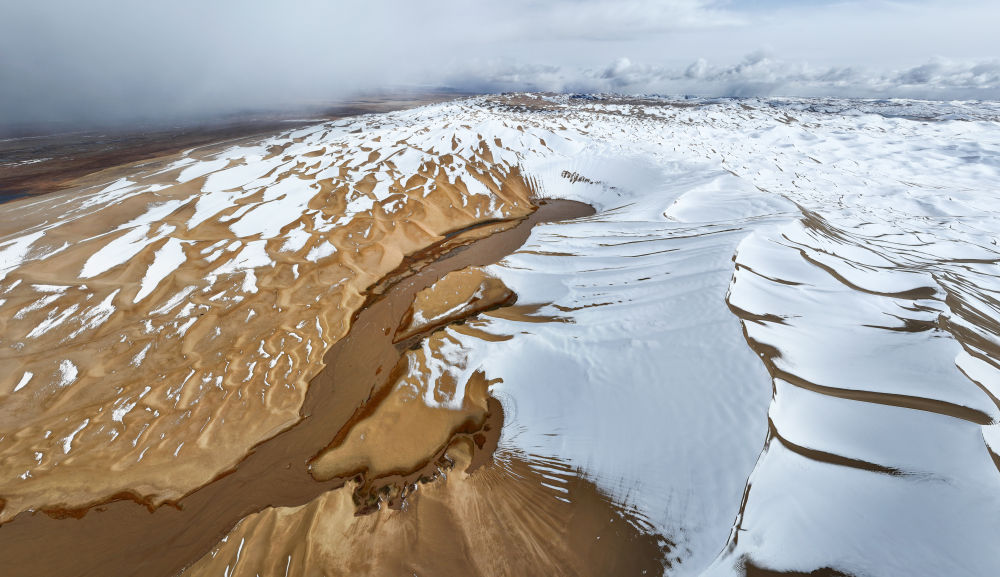 2023年10月16日在新疆阿爾金山國家級自然保護區拍攝的白雪覆蓋的大沙子泉(無(wú)人機照片)。新華社記者 李響 攝