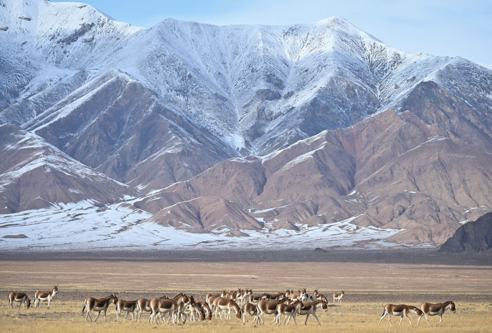 2023年10月16日在新疆阿爾金山國家級自然保護區拍攝的藏野驢(無(wú)人機照片)。新華社記者 李響 攝