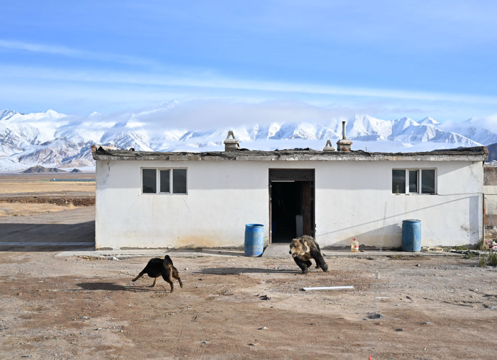 2023年10月17日,一只藏馬熊(右)闖入新疆阿爾金山國家級自然保護區依協(xié)克帕提管護站。新華社記者 李響 攝