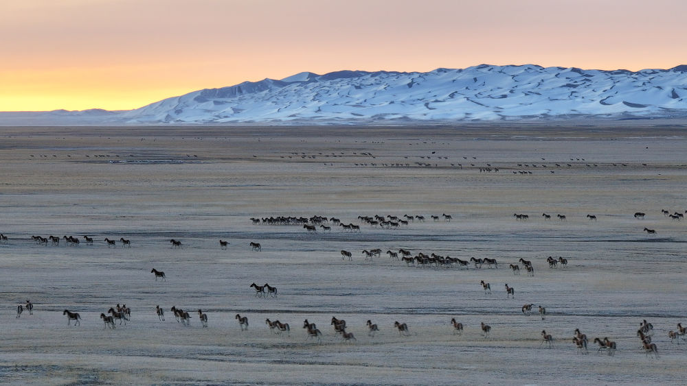 “看!藏野驢正在跟我們賽跑?!毖?zhù)阿爾金山國家級自然保護區管理局巡護員尚鵬手指的方向,記者看見(jiàn)飛揚的塵土中,數百頭藏野驢正在飛馳。