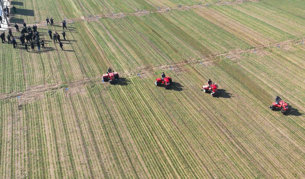 2月23日,山東省“萬(wàn)人下鄉,穩糧保供”農技服務(wù)大行動(dòng)暨2023年“春管春耕春種專(zhuān)項行動(dòng)”在鄒平市啟動(dòng),在鄒平市長(cháng)山鎮八方農場(chǎng)活動(dòng)現場(chǎng),農機手進(jìn)行劃鋤式多功能麥苗鎮壓作業(yè)演示(無(wú)人機照片)。新華社發(fā)(董乃德 攝)