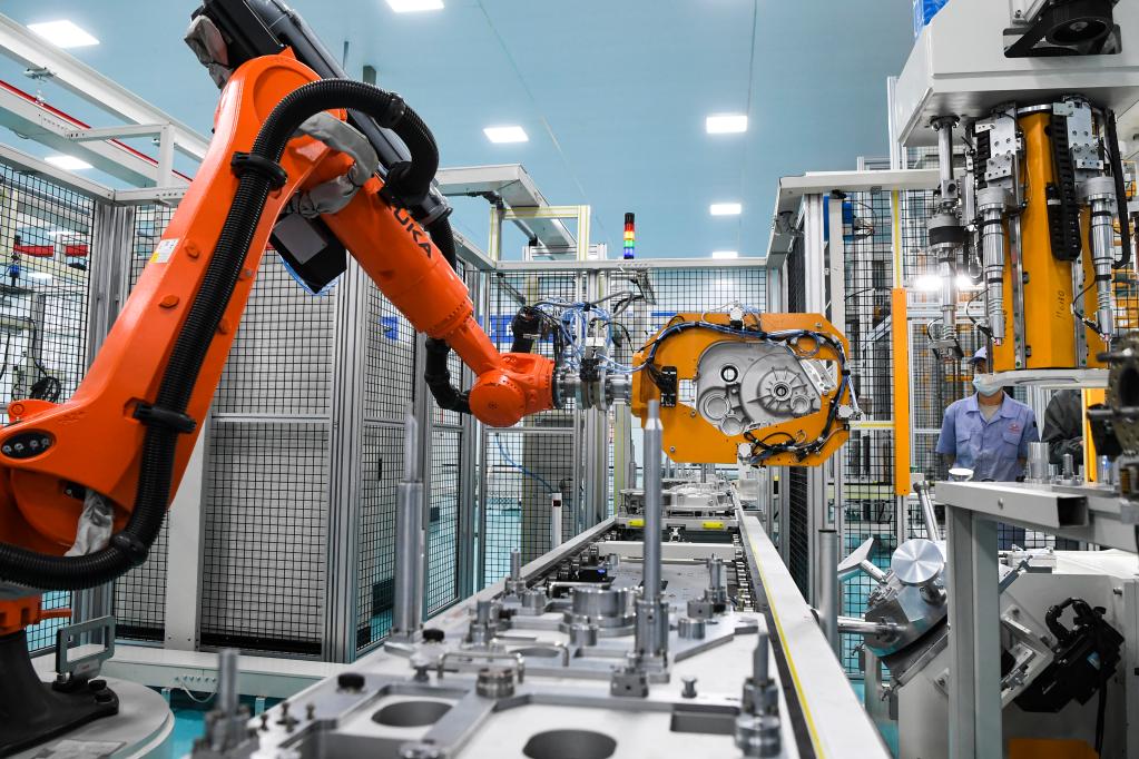 這是2022年10月19日在重慶青山工業(yè)有限公司拍攝的汽車(chē)變速器裝配生產(chǎn)線(xiàn)作業(yè)現場(chǎng)。新華社記者 王全超 攝