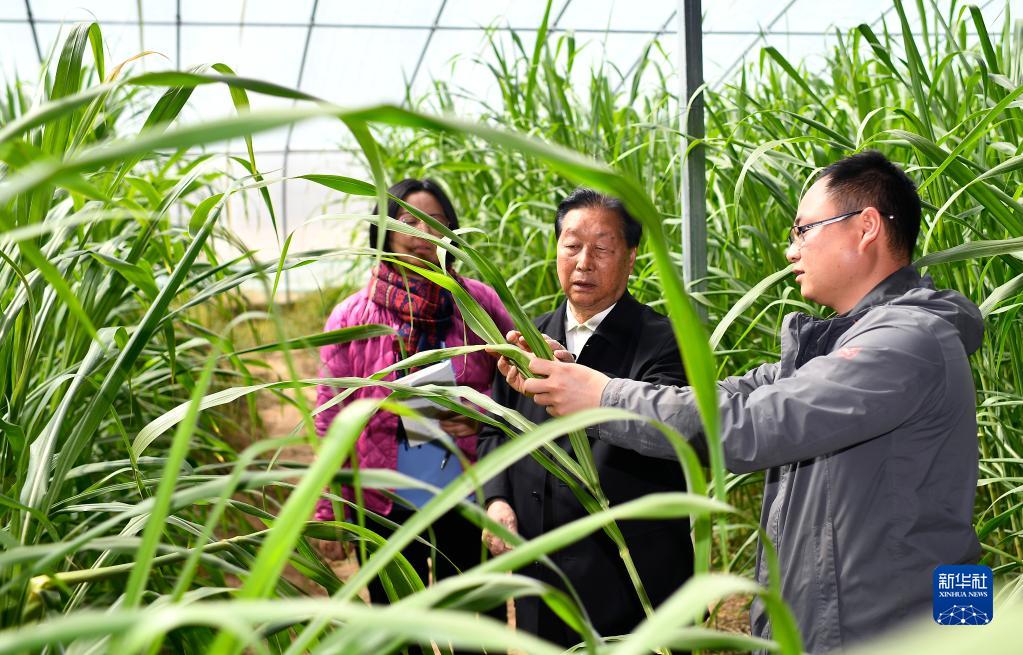 菌草專(zhuān)家林占熺(中)在寧夏銀川市永寧縣閩寧鎮農戶(hù)劉昌富的大棚里查看菌草生長(cháng)情況(2021年3月29日攝)。新華社記者 王鵬 攝