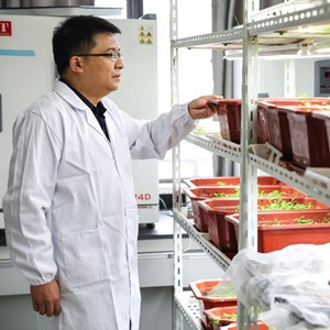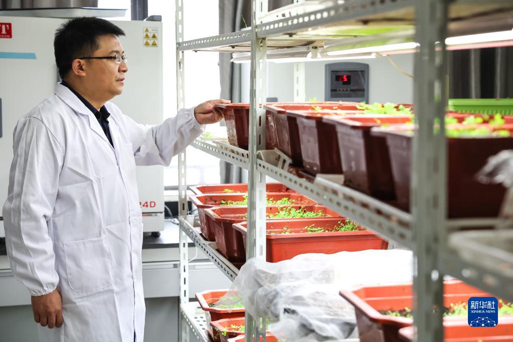 10月20日,貴州大學(xué)動(dòng)物科學(xué)學(xué)院院長(cháng)陳超在實(shí)驗室內觀(guān)察新品種牧草的生長(cháng)情況。新華社記者 歐東衢 攝