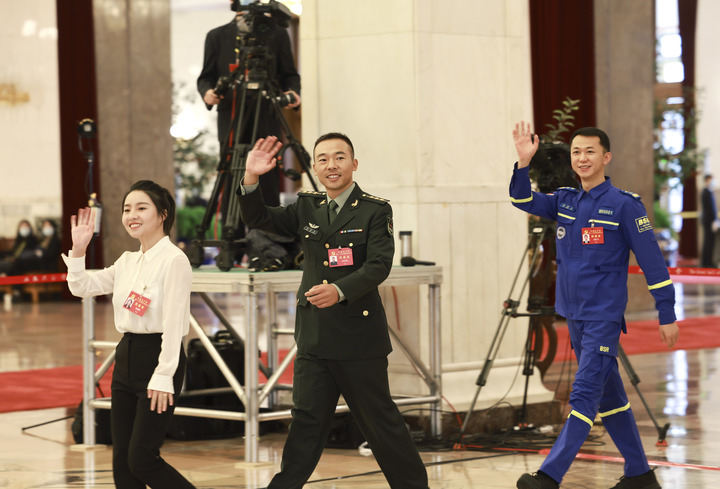 吳燕生、朱敏、張連鋼代表(自左至右)步入“黨代表通道”,準備接受采訪(fǎng)。新華社記者 金良快 攝