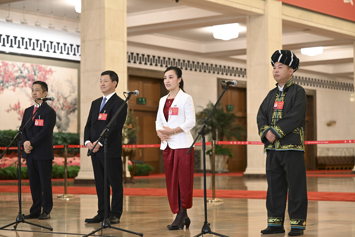 楊彥鋒、宋學(xué)文、祁洪芳、李紹杰代表(自左至右)在“黨代表通道”接受采訪(fǎng)。新華社記者 金良快 攝