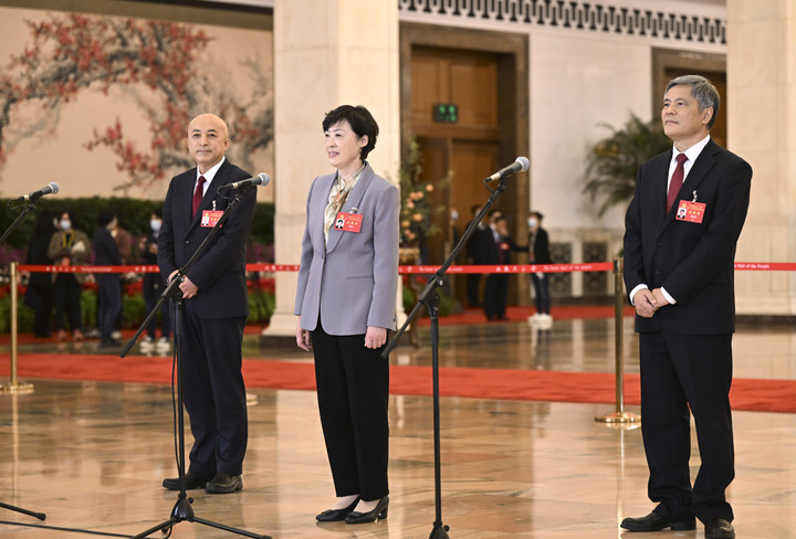 洪家光、楊浪浪、周雷代表(自左至右)在“黨代表通道”接受采訪(fǎng)。新華社記者 金良快 攝