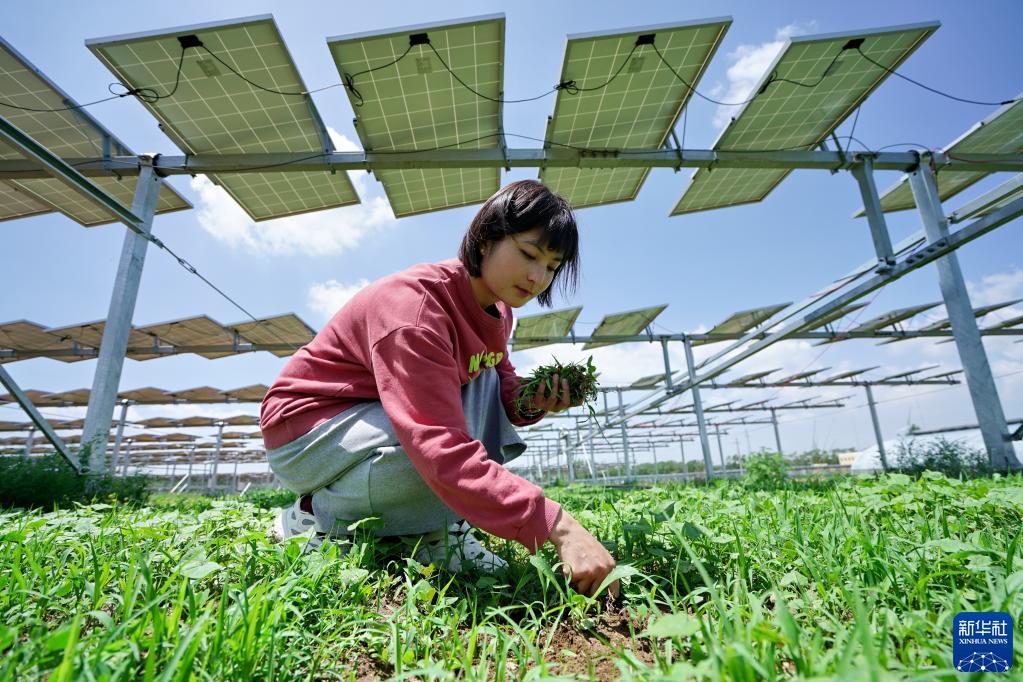 村民徐亞茹在河北省張北縣德勝村“農光互補”項目區光伏發(fā)電板下查看藥材長(cháng)勢(2020年6月23日攝)。新華社記者 牟宇 攝