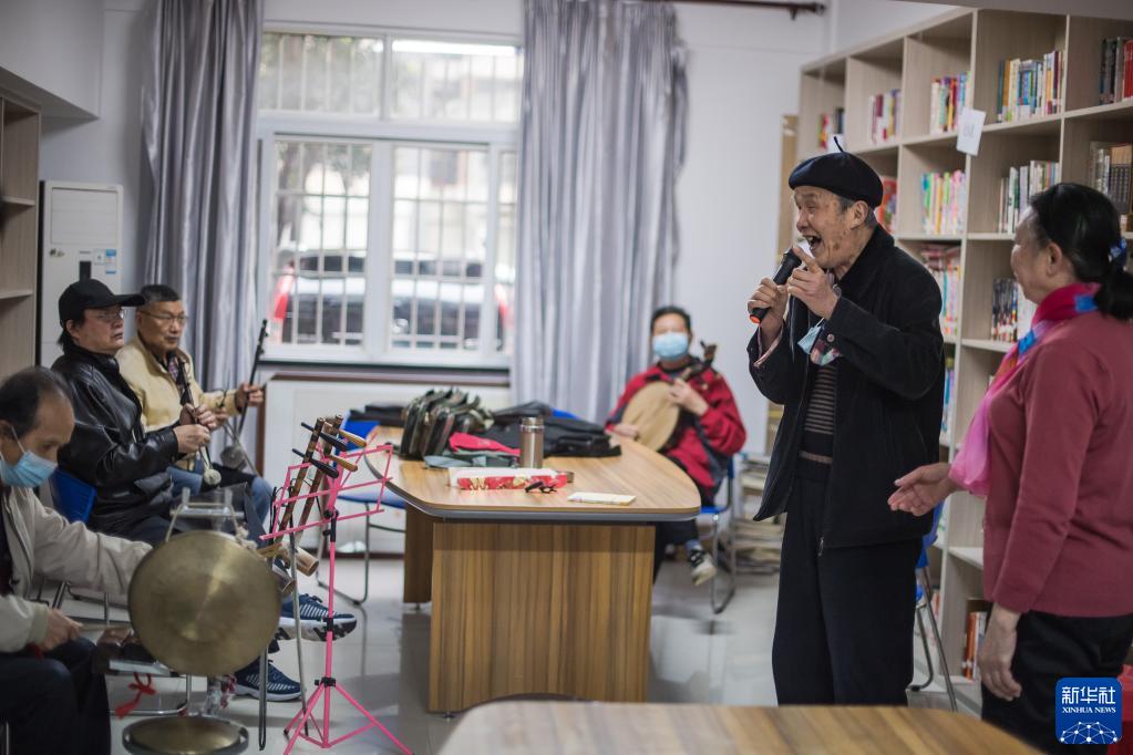 居民在湖北武漢東湖新城社區活動(dòng)室唱楚?。?021年3月31日攝)。新華社記者 肖藝九 攝