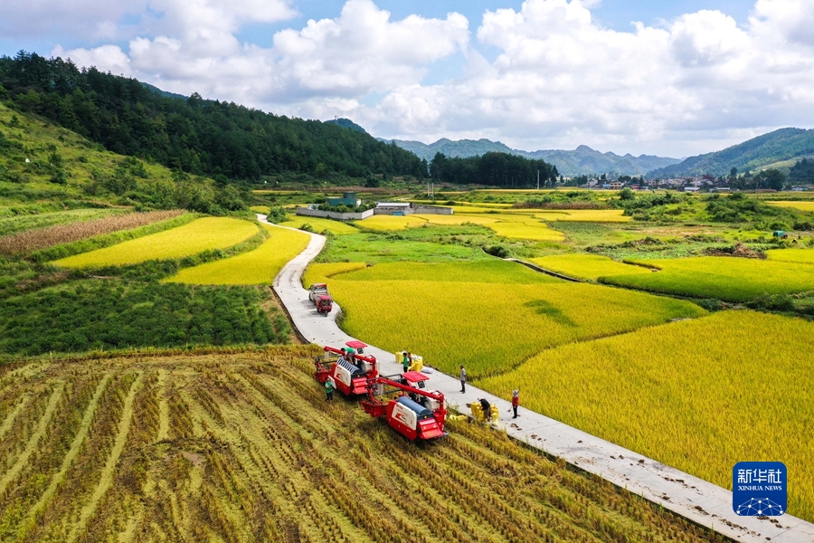 2021年9月15日,貴州省龍里縣灣灘河鎮羊場(chǎng)社區的農民在搶收稻谷(無(wú)人機照片)。 新華社記者 楊文斌 攝