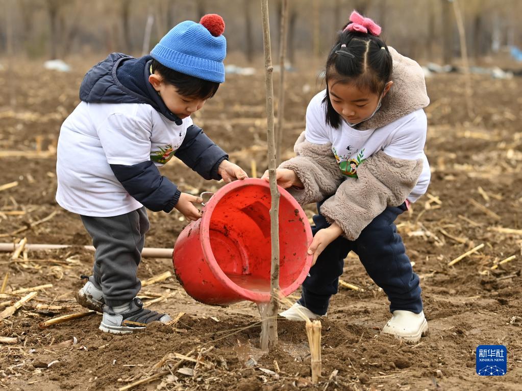 3月12日,在北京第五季龍水鳳港生態(tài)農場(chǎng),小朋友在公益植樹(shù)活動(dòng)上為樹(shù)苗澆水。新華社記者 李賀 攝