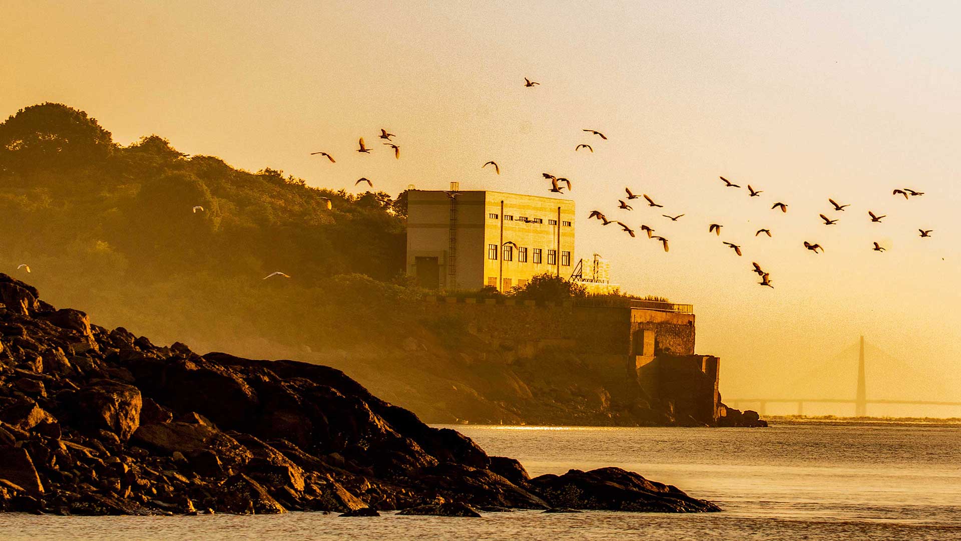 清晨,一群鳥(niǎo)兒掠過(guò)天際,與秦山核電在日出中相互呼應,核電設施與自然相得益彰,共同構建一個(gè)和諧的未來(lái)。